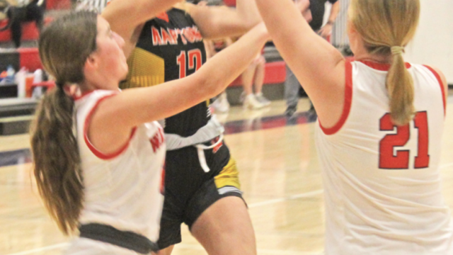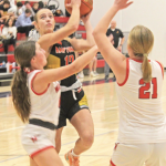 Cora with a contested shot: Ridge View’s Cora Tesch goes up for a shot against Alta-Aurelia on Thursday night. Cora scored eight points in the Raptors’ 56-54 victory. Photo by Brent Harm